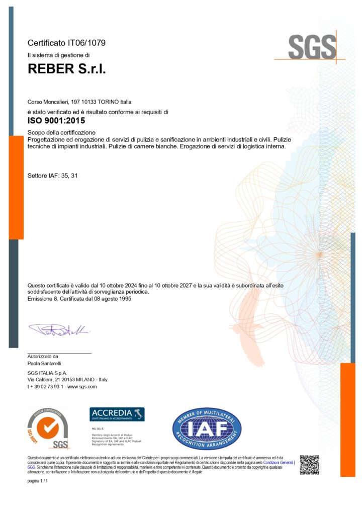 - UNI EN ISO 9001 – Sistema di Gestione della Qualità – certificazione ottenuta nel 1995 (seconda azienda italiana del settore cleaning)